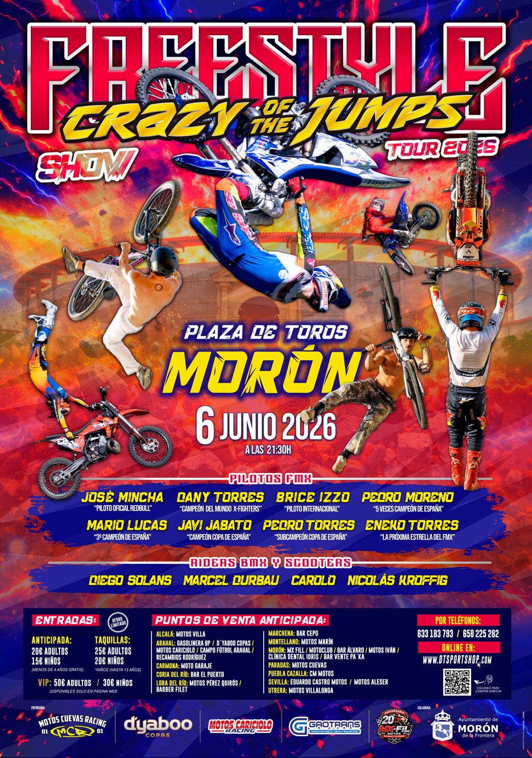 El espectáculo más extremo de Freestyle motocross llega a la Plaza de Toros de Morón con el Crazy of the Jumps Show Tour 2026, un evento único lleno de adrenalina, saltos imposibles y los mejores riders del momento.