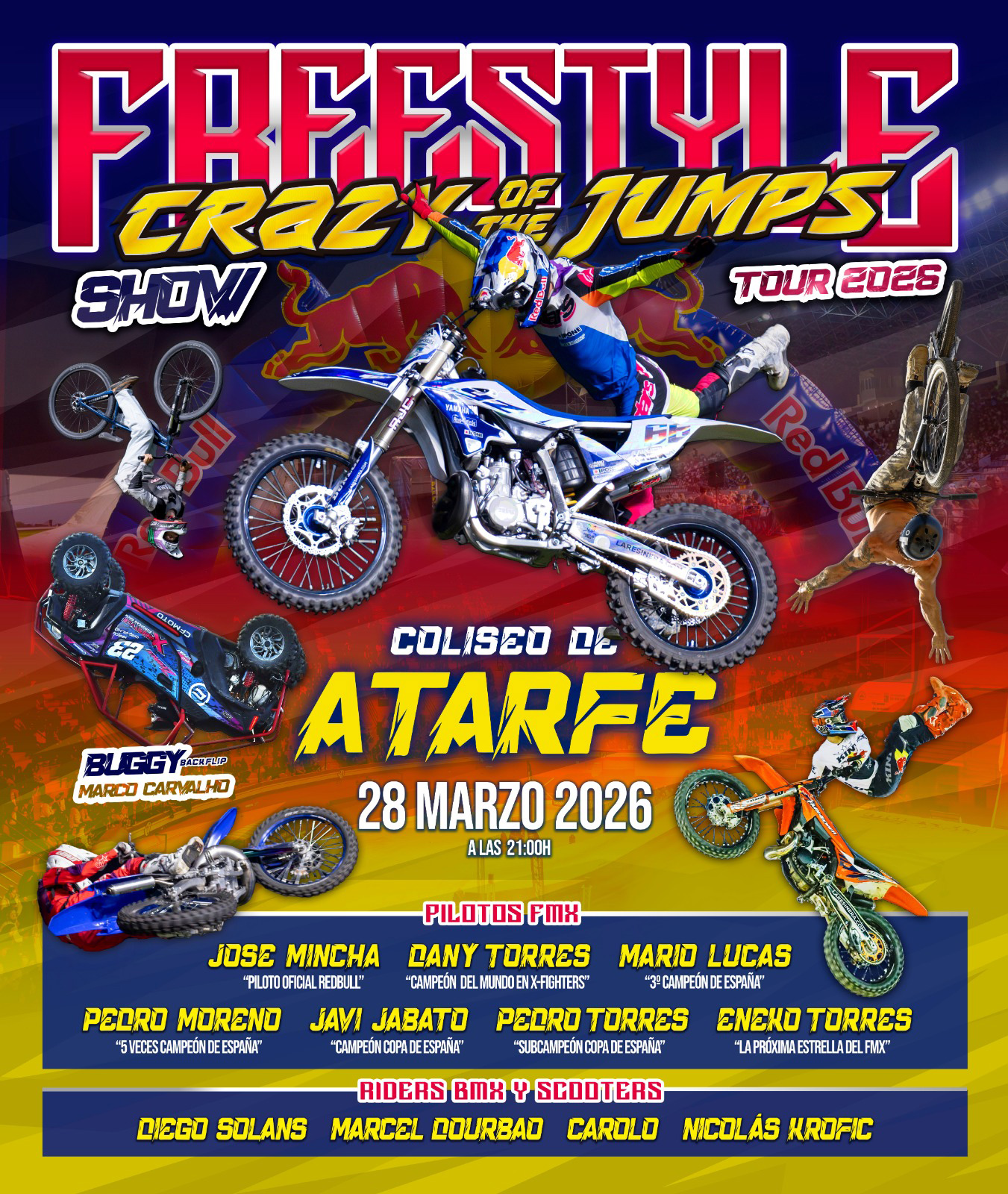 El espectáculo más extremo de Freestyle motocross llega al Coliseo de Atarfe con el Crazy of the Jumps Show Tour 2026, un evento único lleno de adrenalina, saltos imposibles y los mejores riders del momento.